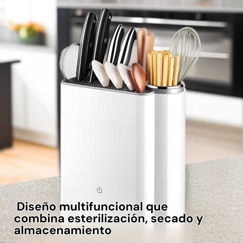 ● Mantén tus cuchillos siempre higiénicos y listos para usar gracias a la esterilización UV que elimina hasta el 99.9% de bacterias y gérmenes. ● Diseño inteligente y moderno que organiza tus cuchillos de manera segura, ahorrando espacio en la cocina y evitando accidentes domésticos. ● Fabricado con materiales de alta calidad, resistente y duradero, ideal para el uso diario y compatible con diferentes tipos y tamaños de cuchillos. ● Fácil de usar: solo coloca los cuchillos y activa la función UV para una desinfección automática y sin complicaciones. ● Aporta un toque de tecnología y elegancia a tu cocina, cuidando la salud de tu familia y prolongando la vida útil de tus utensilios.
